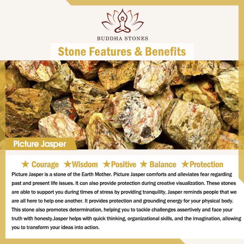 Picture jasper is a type of earth stone. It can comfort and relieve fears related to past and present life problems. It can also offer protection during creative visualization. These stones can bring tranquility during stressful times. Jasper reminds us that we should all support one another. It provides protective and grounding energy for the physical body. This stone also encourages determination, helping you to confront challenges bravely and face the truth honestly. Jasper aids in quick thinking, organizational abilities, and imagination, enabling you to turn your ideas into actions.