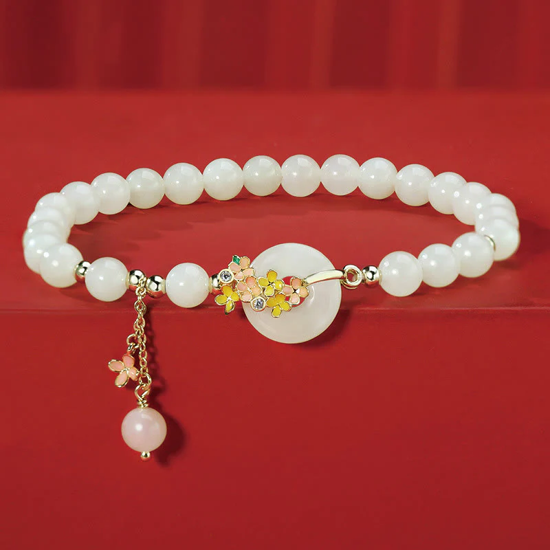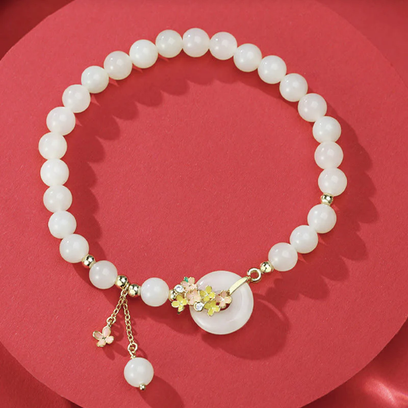 Osmanthus Flowers Peace Buckle Bracelet Necklace Pendant symbolizes peace, prosperity, and protection. The Hetian jade is believed to bring wealth and harmony, and the osmanthus flower design stands for tranquility and growth. The peace buckle represents spiritual tranquility, and the zircon is thought to add extra luck. It's perfect for those seeking spiritual balance, protection, and a continuous stream of good fortune.💕