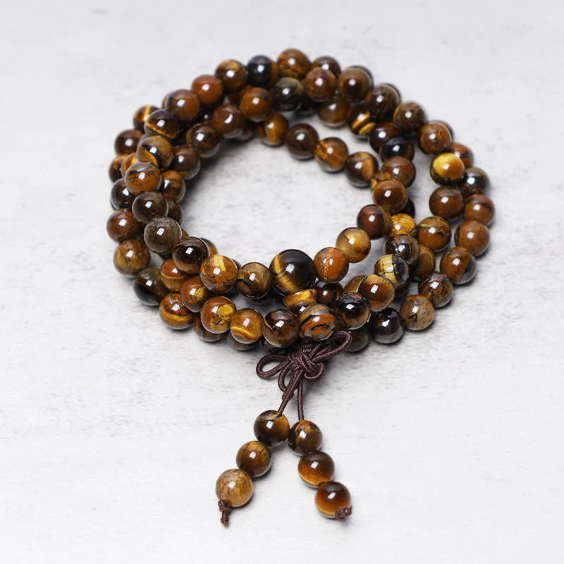 This Tibetan prayer mala, which can be worn as a bracelet or necklace, is crafted with natural tiger eye gemstones. These gemstones are believed to enhance clarity, provide a sense of grounding, and promote balance. Meticulously handmade by skilled artisans, it's an ideal companion for mantra recitation or as a fashionable accessory.