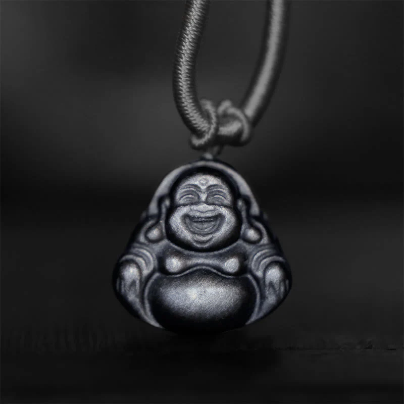 • Natural Silver Sheen Obsidian Laughing Buddha Protection Necklace Pendant