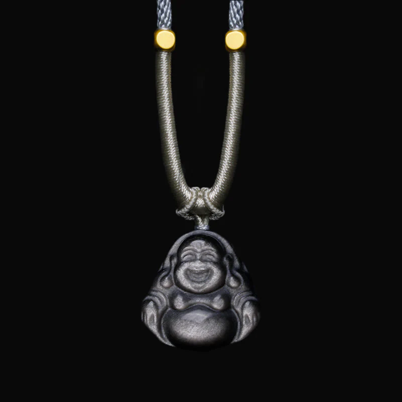 Natural Silver Sheen Obsidian Laughing Buddha Protection Necklace Pendant