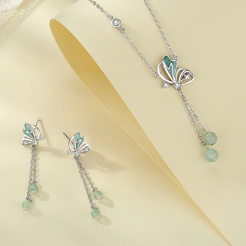 • 925 Sterling Silver Natural Green Aventurine Butterfly Luck Necklace and Earrings Set