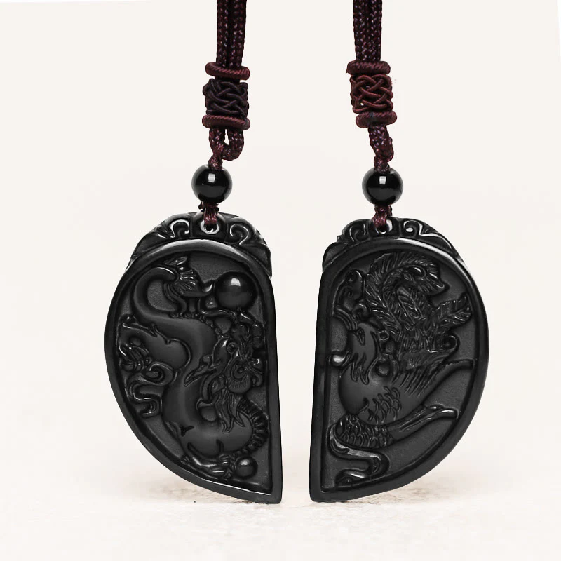 Black Obsidian Love Dragon Phoenix Protection Necklace Pendant