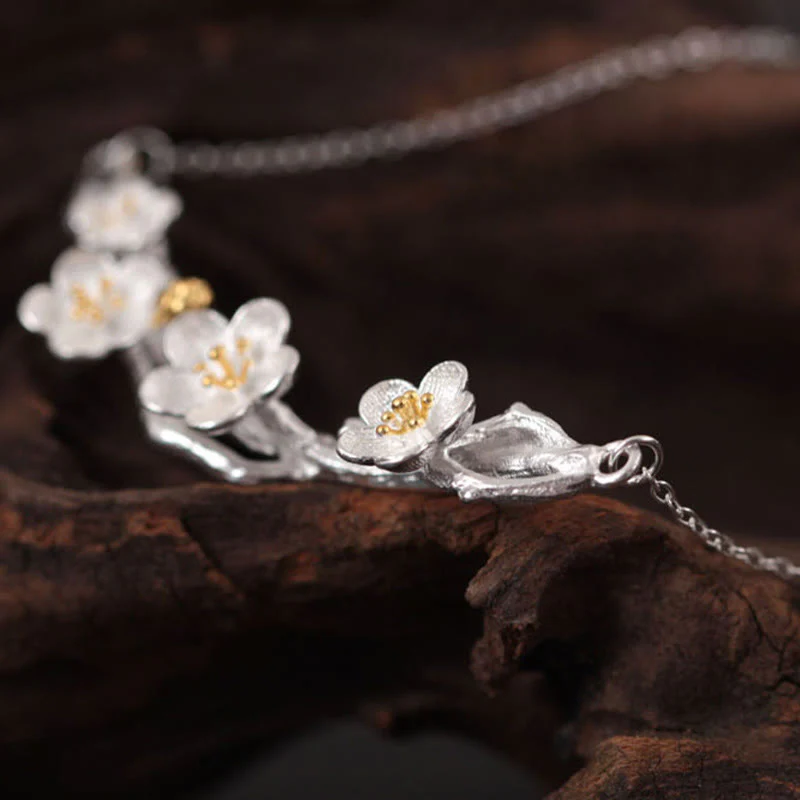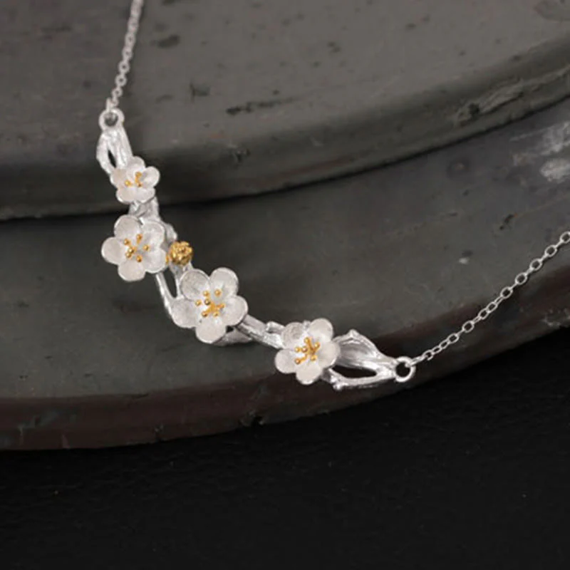 925 Sterling Silver Plum Blossom Pendant Necklace showcases a delicate tree branch design decorated with several small, differently-sized plum blossoms. The detailed flowers are made from 925 sterling silver, with gold-colored centers symbolizing strength and protection. This necklace represents resilience and beauty, capturing the elegance and symbolism of the plum blossom in an elegant design that holds spiritual meaning. 💕