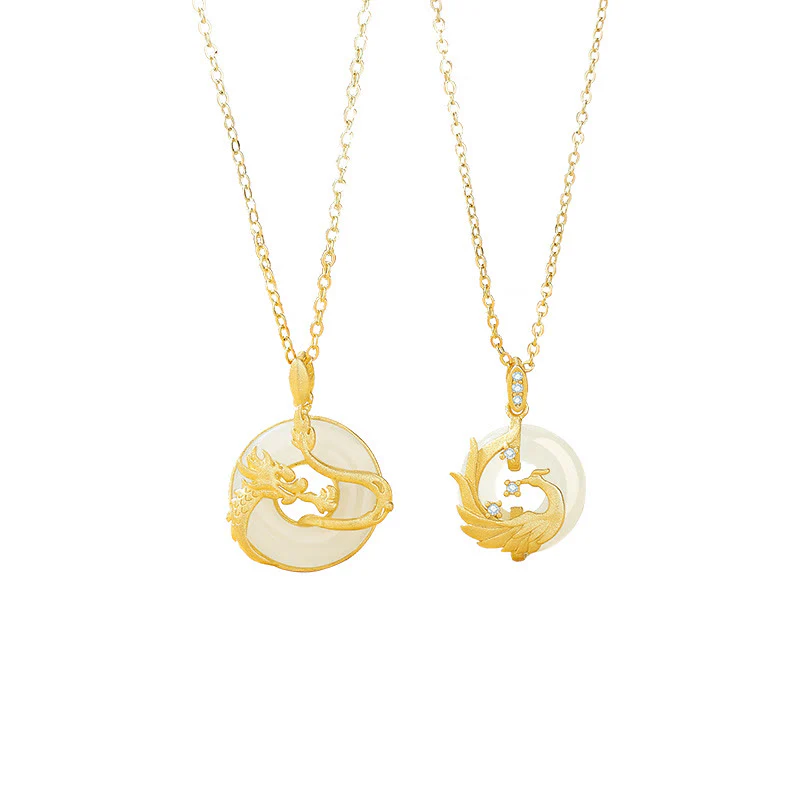 • 925 Sterling Silver Year of the Dragon Hetian Jade Golden Dragon Phoenix Peace Buckle Luck Necklace Pendant