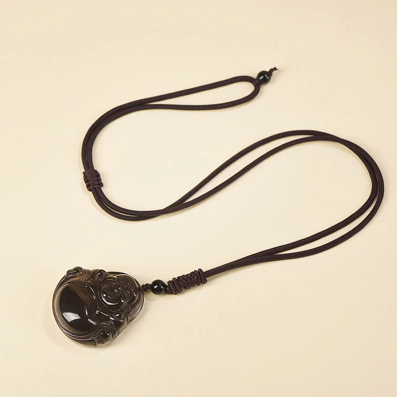 • Natural Black Obsidian Ice Obsidian Laughing Buddha Purification Necklace Pendant