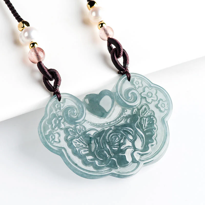 • Natural Jade Peony Flower Lock Necklace Pendant for Good Wishes and Prosperity