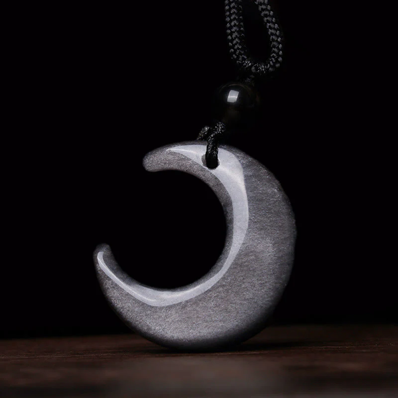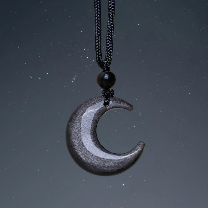 • Natural Silver Sheen Obsidian Selenite Crystal Crescent Moon Yin Yang Couple Protection Necklace Pendant