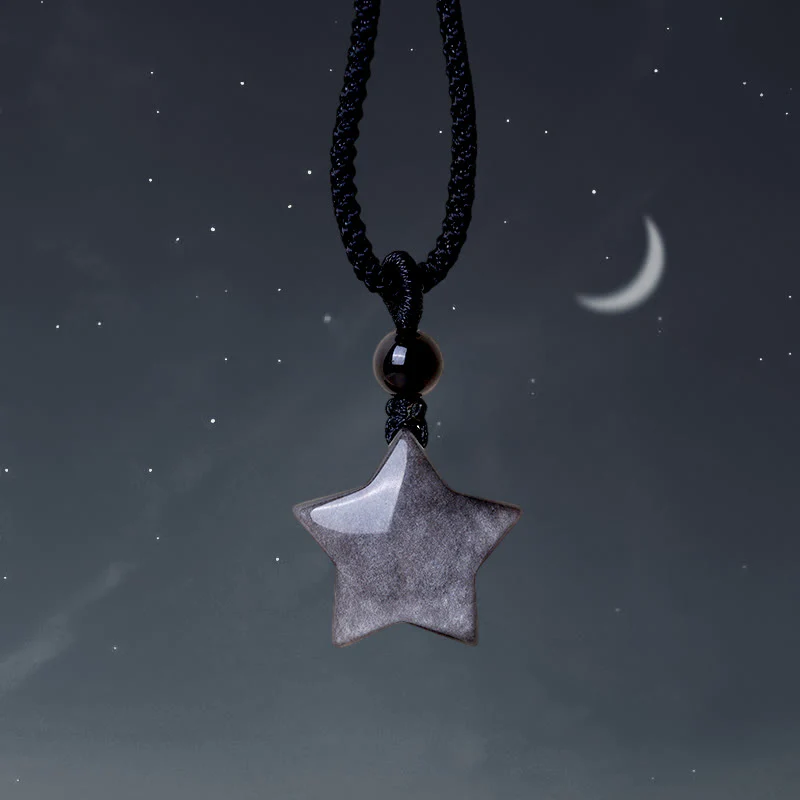 Natural Silver Sheen Obsidian Star Crescent Moon Protection Necklace Pendant
