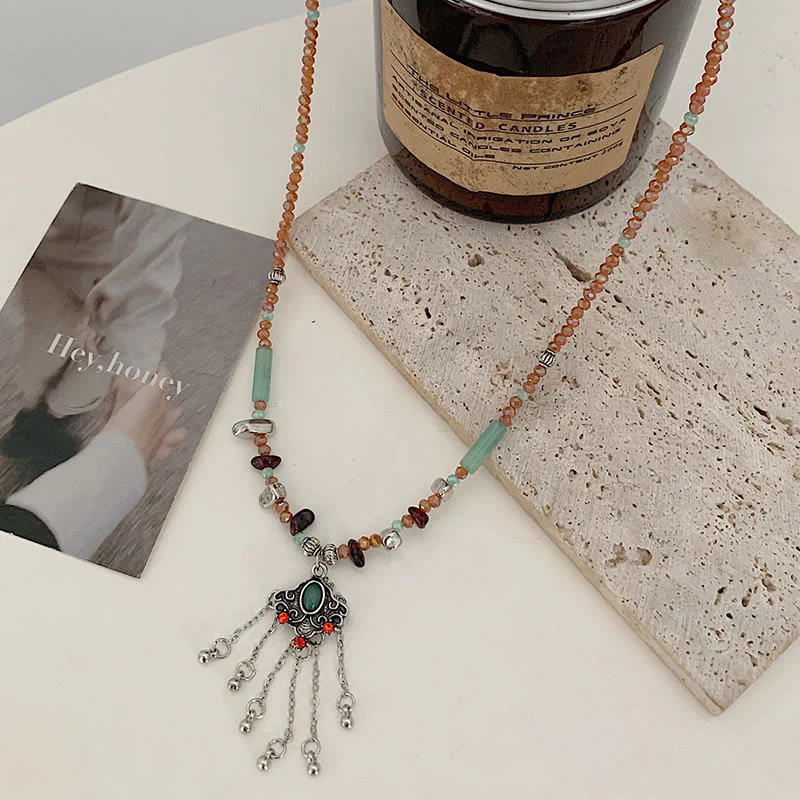 • Tibetan Crystal Stone Copper Luck Tassel Necklace Pendant