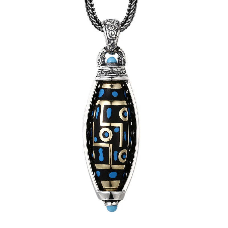A pendant with Om Mani Padme Hum showcases a nine-eye Dzi bead pattern, representing peace and purity. This rotatable necklace pendant has the sacred mantra inscribed on it, helping to promote spiritual enlightenment and calmness. Meticulously crafted, it reminds us to foster inner peace and spiritual development.💕