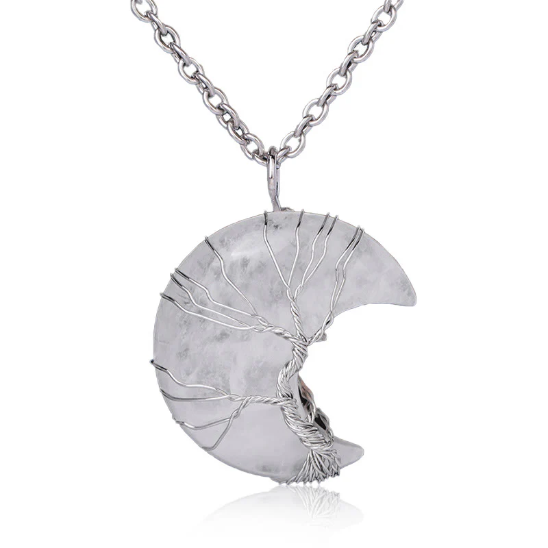 Natural Quartz Crystal Moon Tree of Life Healing Energy Necklace Pendant