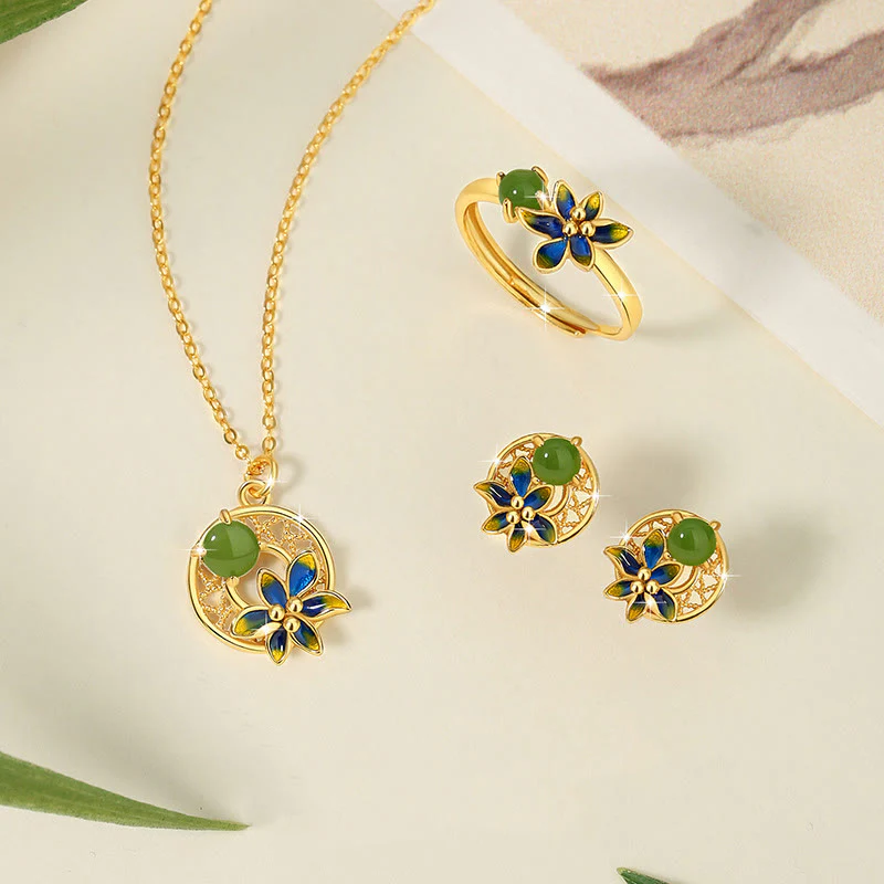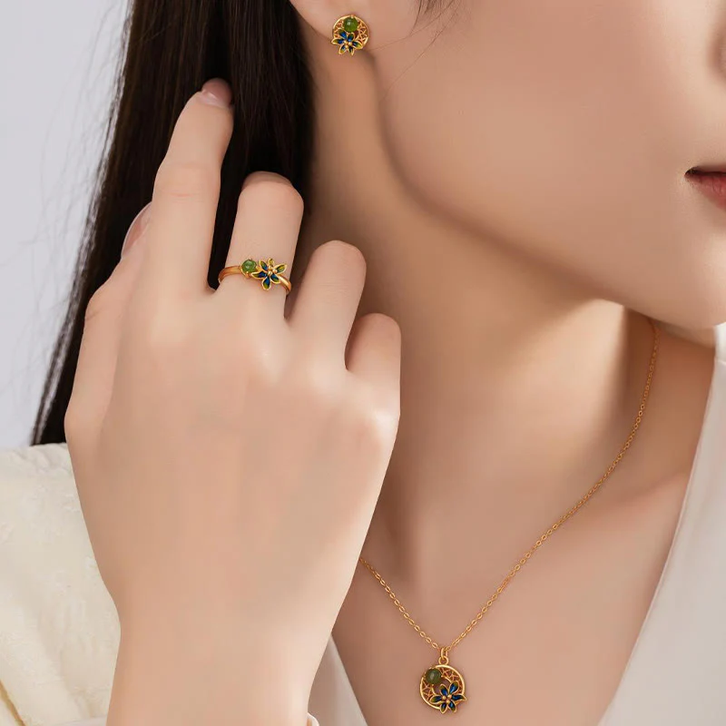 Home / Ring / 925 Sterling Silver Natural Cyan Jade Flower Luck Necklace, Pendant, Ring, and Earrings Set