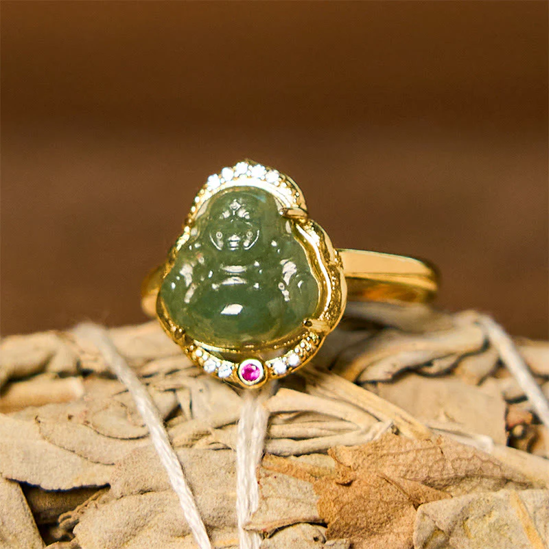 • Natural Hetian Jade Egg Gourd Copper Laughing Buddha Luck Ring